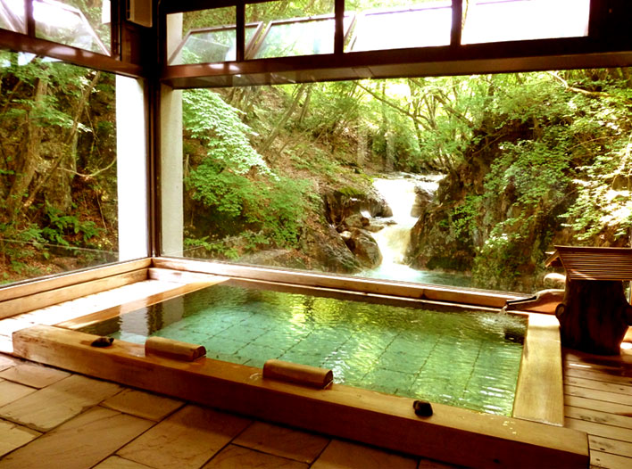 木の香りが漂う大浴場、大自然の中の渓谷が醸しだす幻想的な眺めの露天風呂...